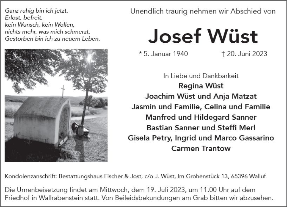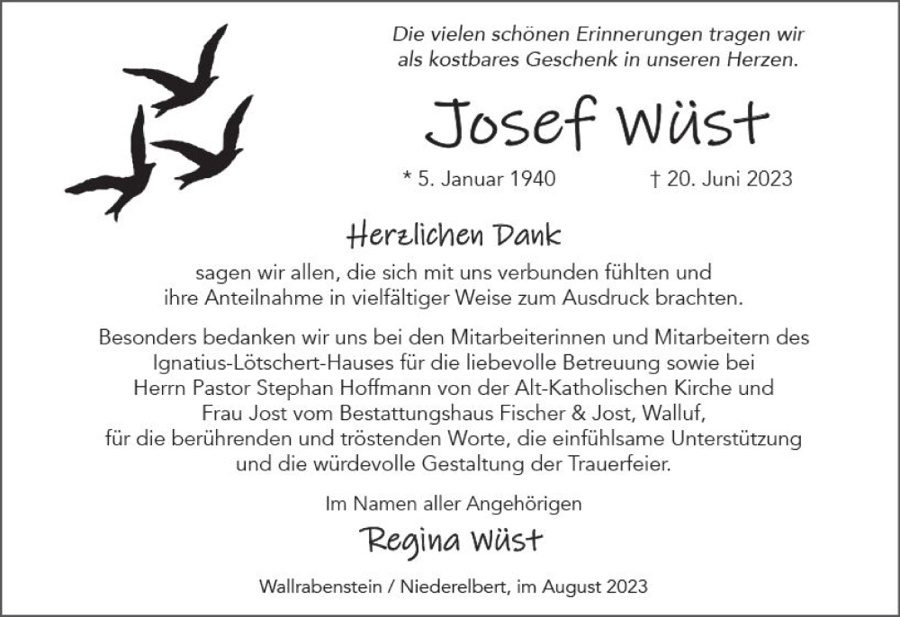 Hier finden Sie alle Traueranzeigen aus der Zeitung, die bisher für Josef Wüst erschienen sind. Weitere Traueranzeigen, die in der Zeitung erscheinen, werden hier ebenfalls aufgelistet