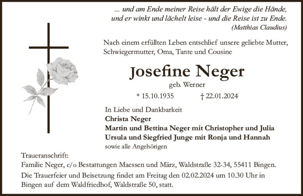 Hier finden Sie alle Traueranzeigen aus der Zeitung, die bisher für Josefine Neger erschienen sind. Weitere Traueranzeigen, die in der Zeitung erscheinen, werden hier ebenfalls aufgelistet