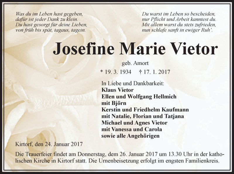 Hier finden Sie alle Traueranzeigen aus der Zeitung, die bisher für Josefine Marie Vietor erschienen sind. Weitere Traueranzeigen, die in der Zeitung erscheinen, werden hier ebenfalls aufgelistet