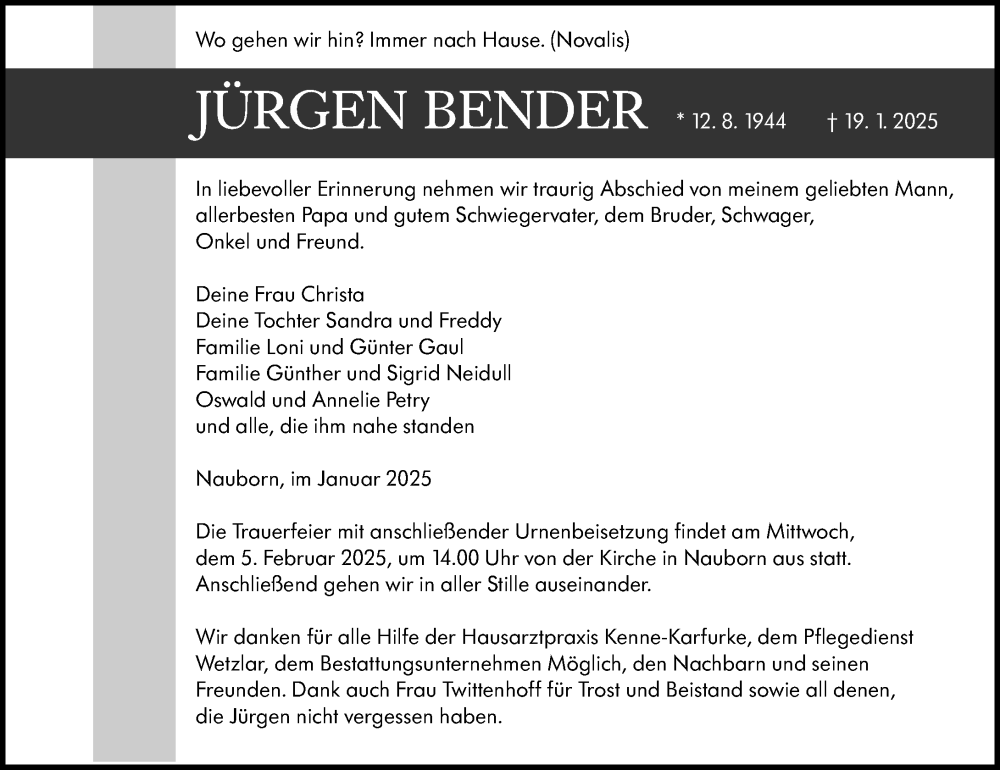 Hier finden Sie alle Traueranzeigen aus der Zeitung, die bisher für Jürgen Bender erschienen sind. Weitere Traueranzeigen, die in der Zeitung erscheinen, werden hier ebenfalls aufgelistet
