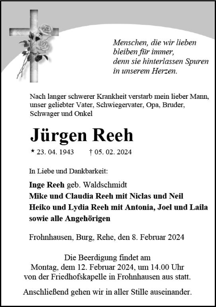 Hier finden Sie alle Traueranzeigen aus der Zeitung, die bisher für Jürgen Reeh erschienen sind. Weitere Traueranzeigen, die in der Zeitung erscheinen, werden hier ebenfalls aufgelistet