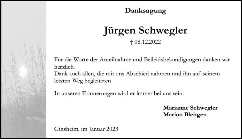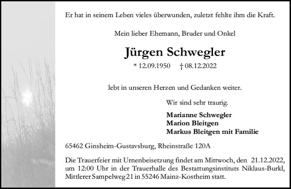 Hier finden Sie alle Traueranzeigen aus der Zeitung, die bisher für Jürgen Schwegler erschienen sind. Weitere Traueranzeigen, die in der Zeitung erscheinen, werden hier ebenfalls aufgelistet