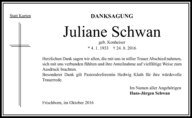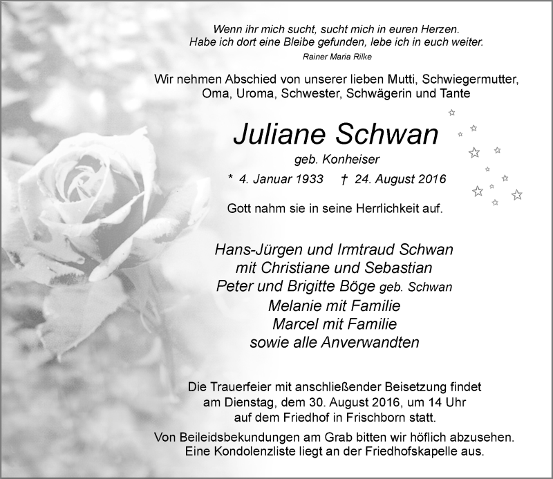 Hier finden Sie alle Traueranzeigen aus der Zeitung, die bisher für Juliane Schwan erschienen sind. Weitere Traueranzeigen, die in der Zeitung erscheinen, werden hier ebenfalls aufgelistet