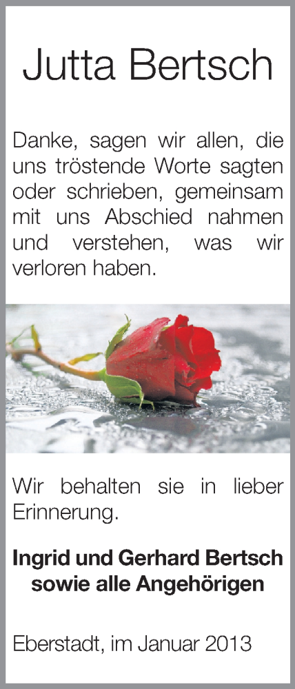 Hier finden Sie alle Traueranzeigen aus der Zeitung, die bisher für Jutta Bertsch erschienen sind. Weitere Traueranzeigen, die in der Zeitung erscheinen, werden hier ebenfalls aufgelistet