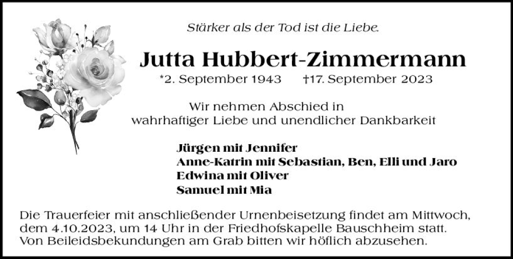Hier finden Sie alle Traueranzeigen aus der Zeitung, die bisher für Jutta Hubbert-Zimmermann erschienen sind. Weitere Traueranzeigen, die in der Zeitung erscheinen, werden hier ebenfalls aufgelistet