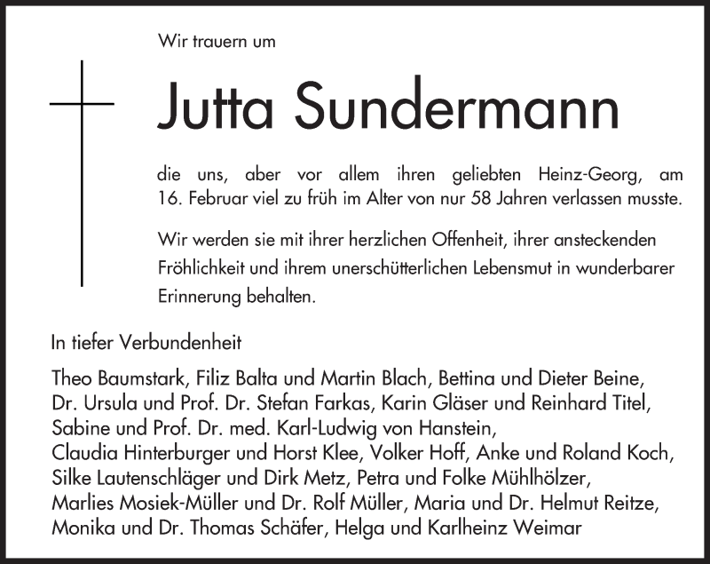 Hier finden Sie alle Traueranzeigen aus der Zeitung, die bisher für Jutta Sundermann erschienen sind. Weitere Traueranzeigen, die in der Zeitung erscheinen, werden hier ebenfalls aufgelistet
