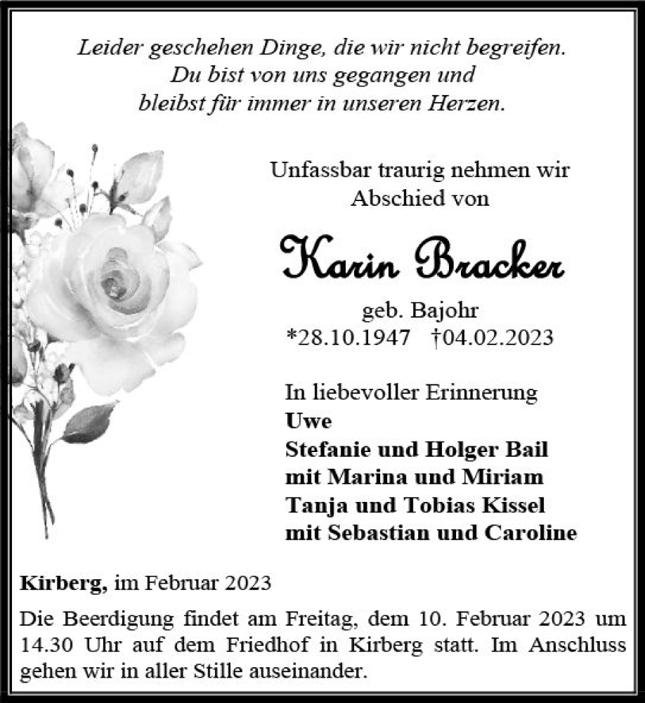 Hier finden Sie alle Traueranzeigen aus der Zeitung, die bisher für Karin Bracker erschienen sind. Weitere Traueranzeigen, die in der Zeitung erscheinen, werden hier ebenfalls aufgelistet