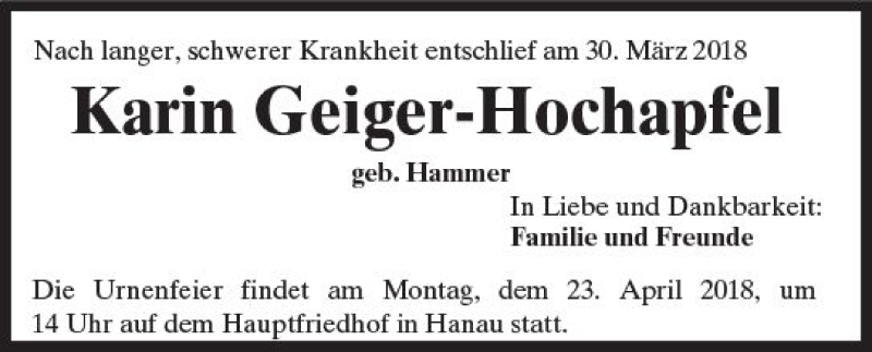 Hier finden Sie alle Traueranzeigen aus der Zeitung, die bisher für Karin Geiger-Hochapfel erschienen sind. Weitere Traueranzeigen, die in der Zeitung erscheinen, werden hier ebenfalls aufgelistet
