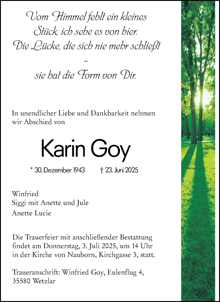 Hier finden Sie alle Traueranzeigen aus der Zeitung, die bisher für Karin Goy erschienen sind. Weitere Traueranzeigen, die in der Zeitung erscheinen, werden hier ebenfalls aufgelistet