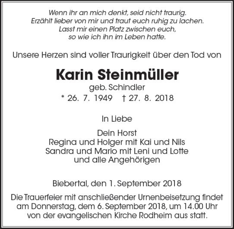 Hier finden Sie alle Traueranzeigen aus der Zeitung, die bisher für Karin Steinmüller erschienen sind. Weitere Traueranzeigen, die in der Zeitung erscheinen, werden hier ebenfalls aufgelistet