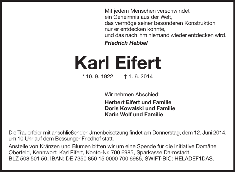 Hier finden Sie alle Traueranzeigen aus der Zeitung, die bisher für Karl Eifert erschienen sind. Weitere Traueranzeigen, die in der Zeitung erscheinen, werden hier ebenfalls aufgelistet