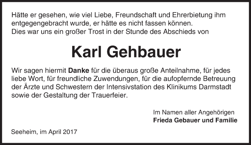 Hier finden Sie alle Traueranzeigen aus der Zeitung, die bisher für Karl Gehbauer erschienen sind. Weitere Traueranzeigen, die in der Zeitung erscheinen, werden hier ebenfalls aufgelistet