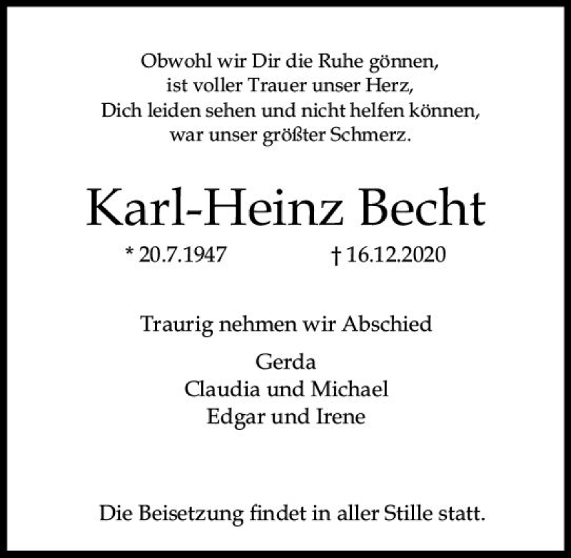 Hier finden Sie alle Traueranzeigen aus der Zeitung, die bisher für Karl-Heinz Becht erschienen sind. Weitere Traueranzeigen, die in der Zeitung erscheinen, werden hier ebenfalls aufgelistet