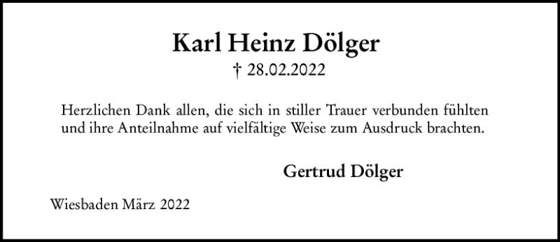Hier finden Sie alle Traueranzeigen aus der Zeitung, die bisher für Karl Heinz Dölger erschienen sind. Weitere Traueranzeigen, die in der Zeitung erscheinen, werden hier ebenfalls aufgelistet