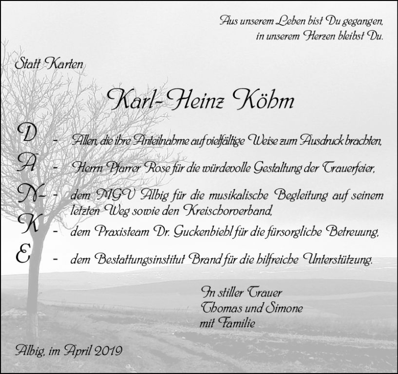 Hier finden Sie alle Traueranzeigen aus der Zeitung, die bisher für Karl-Heinz Köhm erschienen sind. Weitere Traueranzeigen, die in der Zeitung erscheinen, werden hier ebenfalls aufgelistet