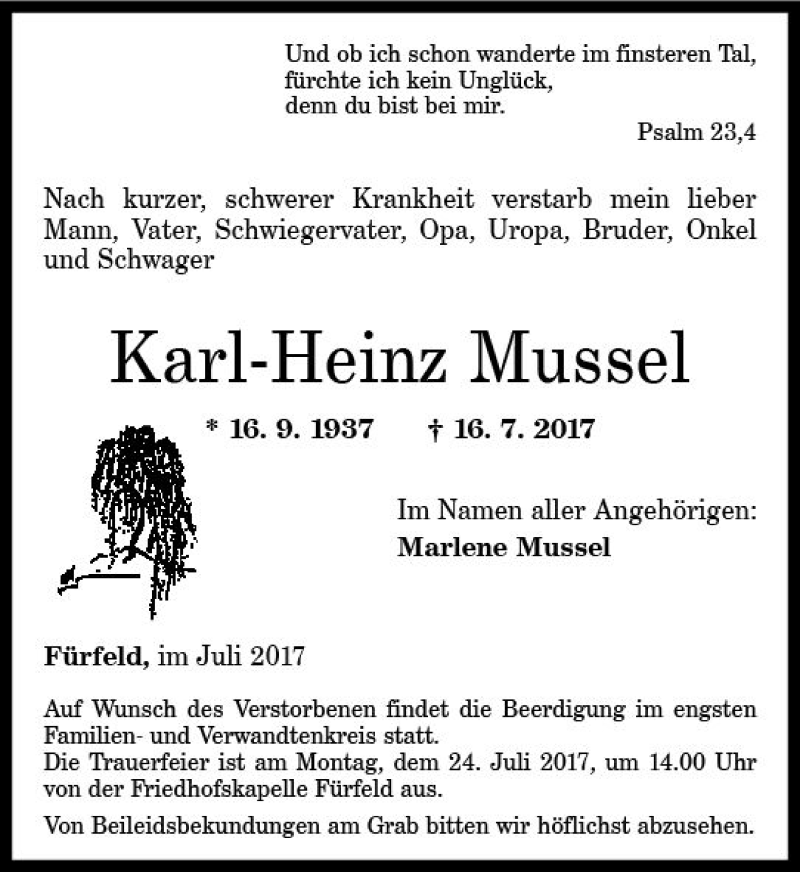 Hier finden Sie alle Traueranzeigen aus der Zeitung, die bisher für Karl-Heinz Mussel erschienen sind. Weitere Traueranzeigen, die in der Zeitung erscheinen, werden hier ebenfalls aufgelistet