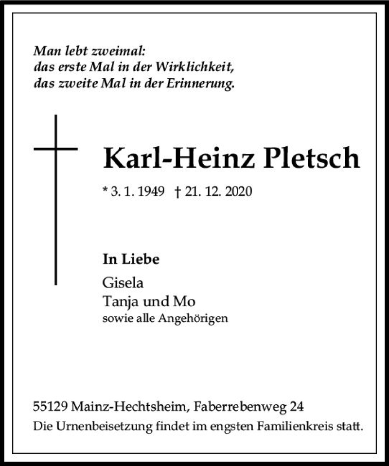 Hier finden Sie alle Traueranzeigen aus der Zeitung, die bisher für Karl-Heinz Pletsch erschienen sind. Weitere Traueranzeigen, die in der Zeitung erscheinen, werden hier ebenfalls aufgelistet