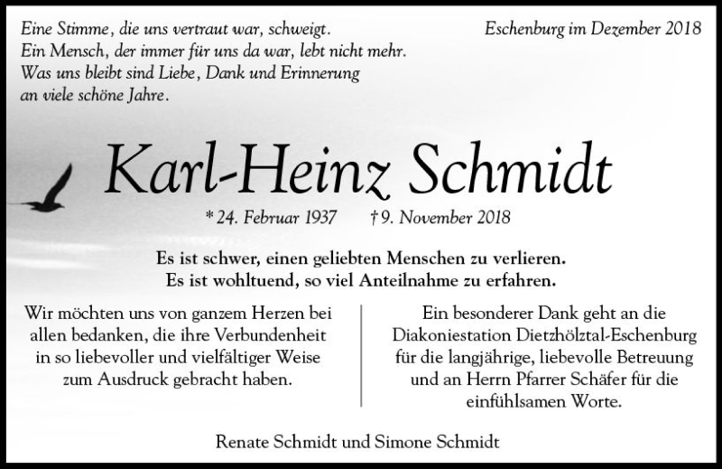 Hier finden Sie alle Traueranzeigen aus der Zeitung, die bisher für Karl-Heinz Schmidt erschienen sind. Weitere Traueranzeigen, die in der Zeitung erscheinen, werden hier ebenfalls aufgelistet