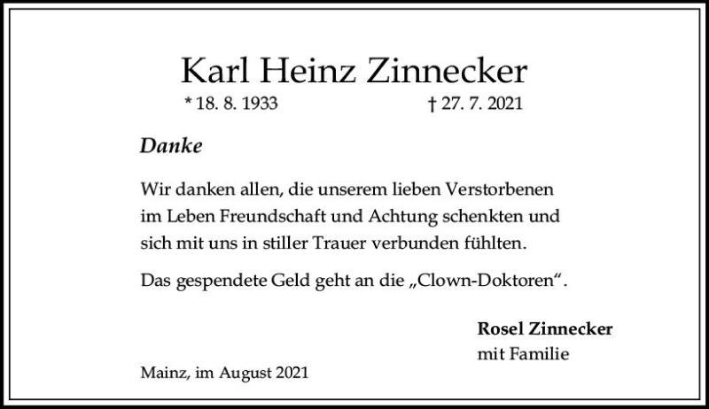 Hier finden Sie alle Traueranzeigen aus der Zeitung, die bisher für Karl Heinz Zinnecker erschienen sind. Weitere Traueranzeigen, die in der Zeitung erscheinen, werden hier ebenfalls aufgelistet