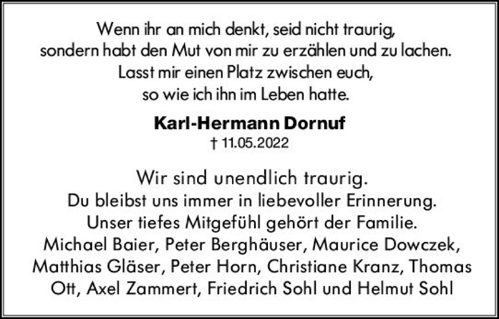 Hier finden Sie alle Traueranzeigen aus der Zeitung, die bisher für Karl-Hermann Dornuf erschienen sind. Weitere Traueranzeigen, die in der Zeitung erscheinen, werden hier ebenfalls aufgelistet