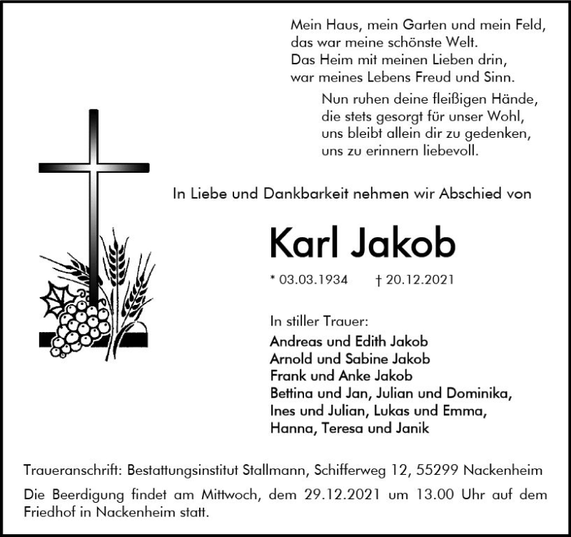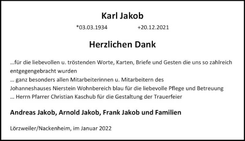 Hier finden Sie alle Traueranzeigen aus der Zeitung, die bisher für Karl Jakob erschienen sind. Weitere Traueranzeigen, die in der Zeitung erscheinen, werden hier ebenfalls aufgelistet
