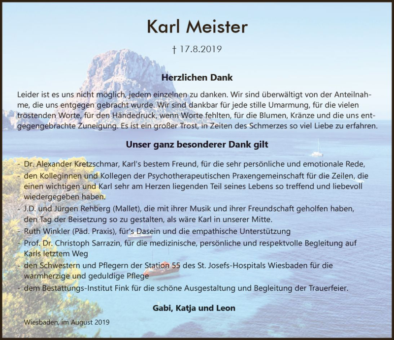 Hier finden Sie alle Traueranzeigen aus der Zeitung, die bisher für Karl Meister erschienen sind. Weitere Traueranzeigen, die in der Zeitung erscheinen, werden hier ebenfalls aufgelistet