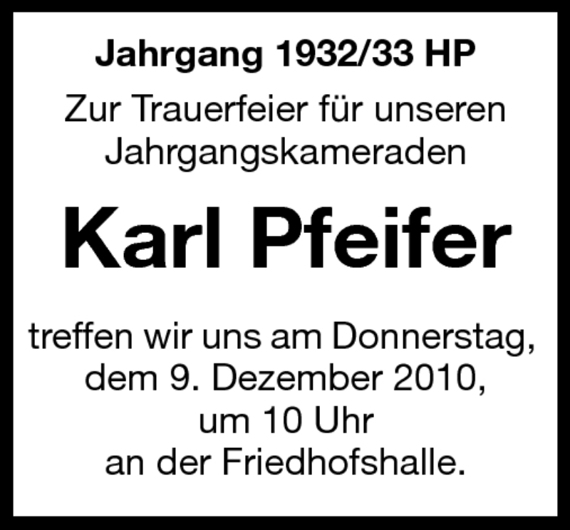 Hier finden Sie alle Traueranzeigen aus der Zeitung, die bisher für Karl Pfeifer erschienen sind. Weitere Traueranzeigen, die in der Zeitung erscheinen, werden hier ebenfalls aufgelistet