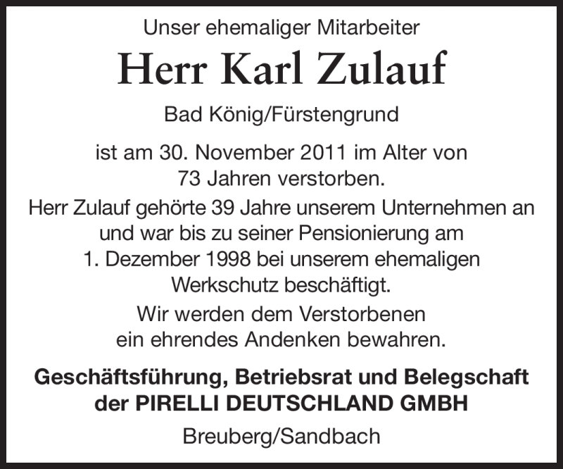 Hier finden Sie alle Traueranzeigen aus der Zeitung, die bisher für Karl Zulauf erschienen sind. Weitere Traueranzeigen, die in der Zeitung erscheinen, werden hier ebenfalls aufgelistet