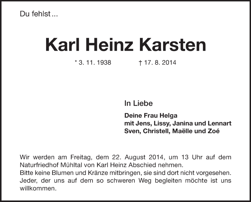 Hier finden Sie alle Traueranzeigen aus der Zeitung, die bisher für Karl Heinz Karsten erschienen sind. Weitere Traueranzeigen, die in der Zeitung erscheinen, werden hier ebenfalls aufgelistet