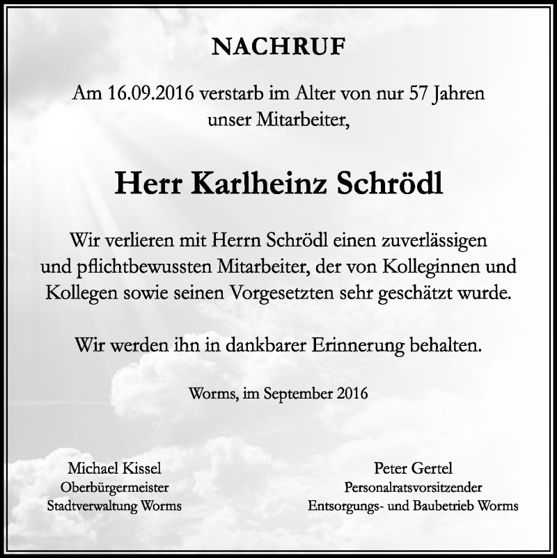 Hier finden Sie alle Traueranzeigen aus der Zeitung, die bisher für Karlheinz Schrödl erschienen sind. Weitere Traueranzeigen, die in der Zeitung erscheinen, werden hier ebenfalls aufgelistet