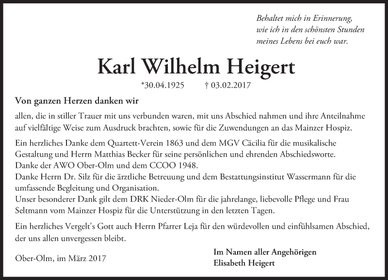 Hier finden Sie alle Traueranzeigen aus der Zeitung, die bisher für Karl Wilhelm Heigert erschienen sind. Weitere Traueranzeigen, die in der Zeitung erscheinen, werden hier ebenfalls aufgelistet