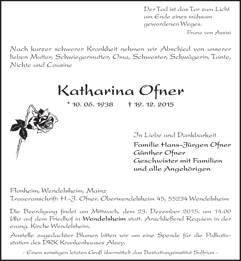 Hier finden Sie alle Traueranzeigen aus der Zeitung, die bisher für Katharina Ofner erschienen sind. Weitere Traueranzeigen, die in der Zeitung erscheinen, werden hier ebenfalls aufgelistet