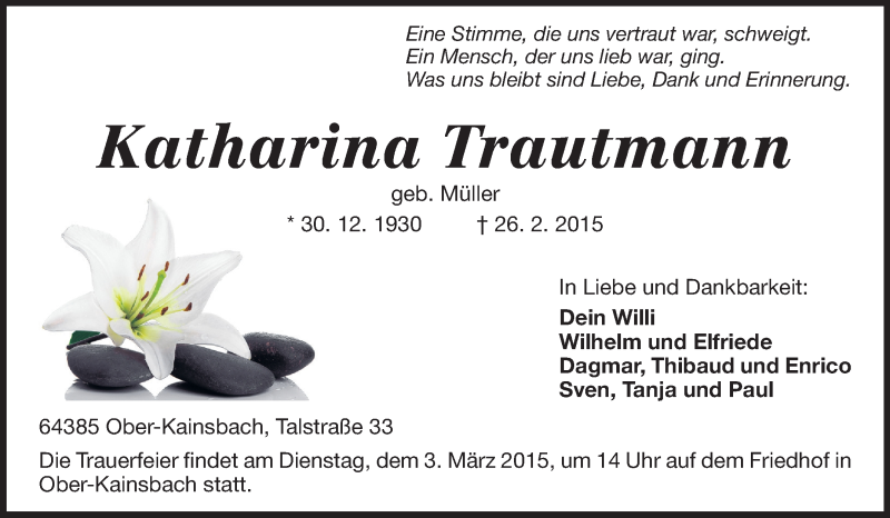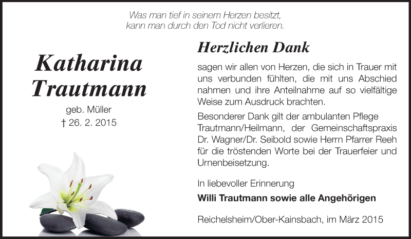Hier finden Sie alle Traueranzeigen aus der Zeitung, die bisher für Katharina Trautmann erschienen sind. Weitere Traueranzeigen, die in der Zeitung erscheinen, werden hier ebenfalls aufgelistet