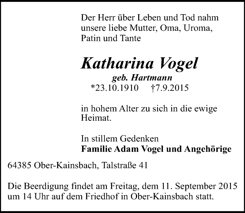 Hier finden Sie alle Traueranzeigen aus der Zeitung, die bisher für Katharina Vogel erschienen sind. Weitere Traueranzeigen, die in der Zeitung erscheinen, werden hier ebenfalls aufgelistet