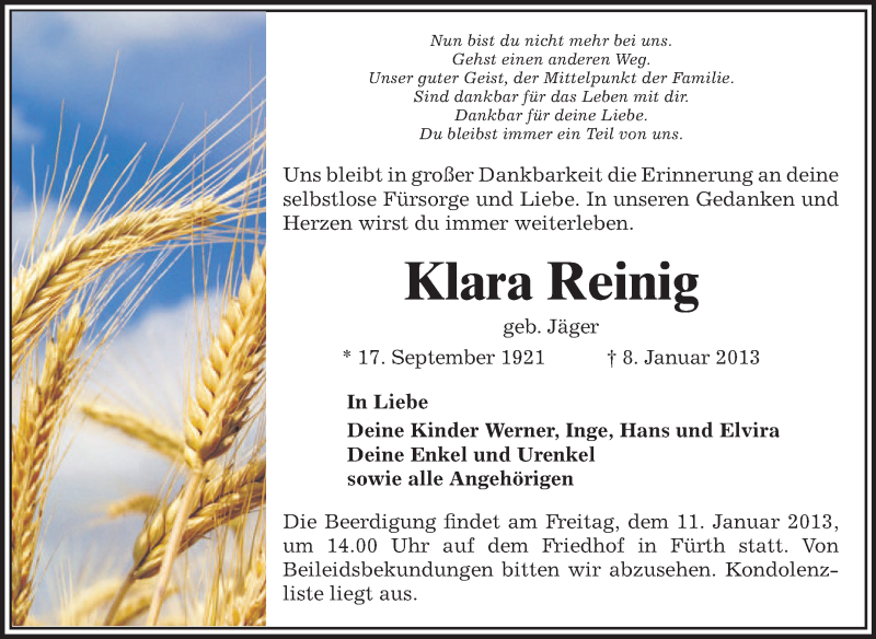 Hier finden Sie alle Traueranzeigen aus der Zeitung, die bisher für Klara Reinig erschienen sind. Weitere Traueranzeigen, die in der Zeitung erscheinen, werden hier ebenfalls aufgelistet