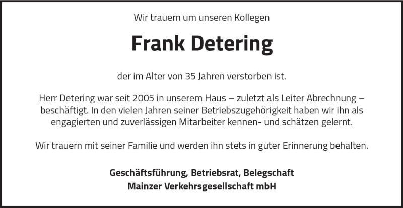 Hier finden Sie alle Traueranzeigen aus der Zeitung, die bisher für Klaus Detering erschienen sind. Weitere Traueranzeigen, die in der Zeitung erscheinen, werden hier ebenfalls aufgelistet