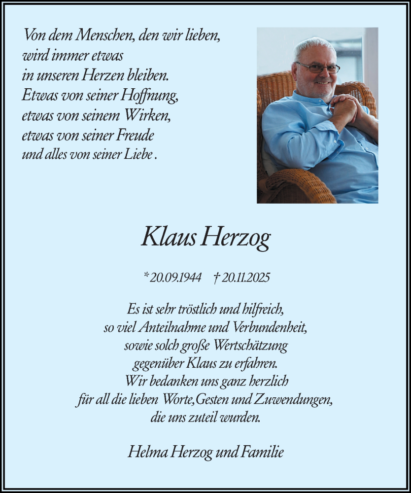 Hier finden Sie alle Traueranzeigen aus der Zeitung, die bisher für Klaus Herzog erschienen sind. Weitere Traueranzeigen, die in der Zeitung erscheinen, werden hier ebenfalls aufgelistet