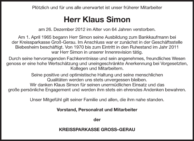 Hier finden Sie alle Traueranzeigen aus der Zeitung, die bisher für Klaus Simon erschienen sind. Weitere Traueranzeigen, die in der Zeitung erscheinen, werden hier ebenfalls aufgelistet