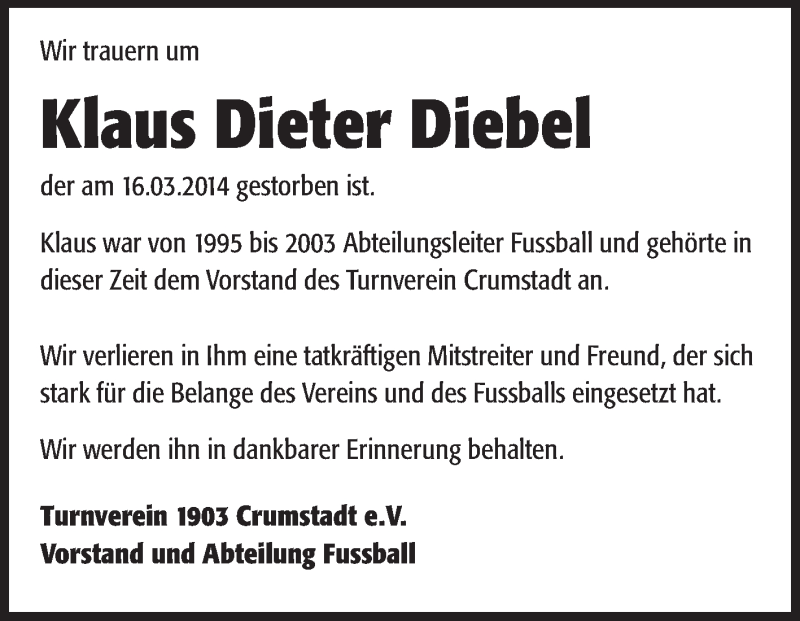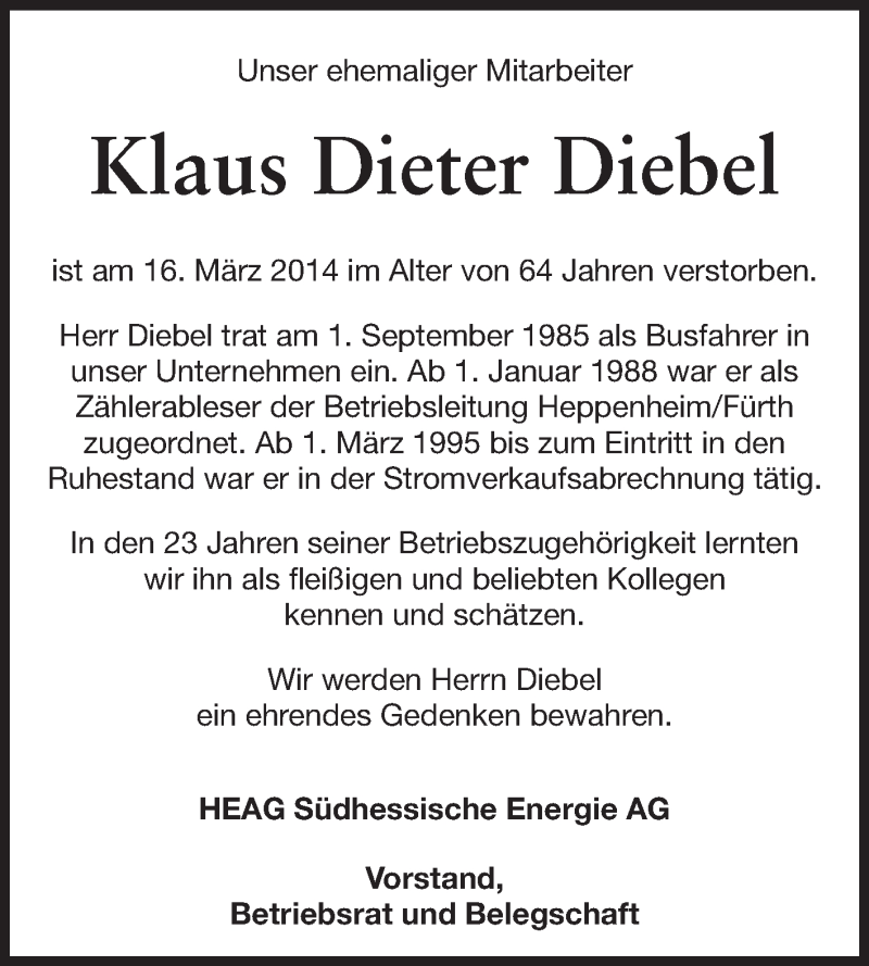Hier finden Sie alle Traueranzeigen aus der Zeitung, die bisher für Klaus Dieter Diebel erschienen sind. Weitere Traueranzeigen, die in der Zeitung erscheinen, werden hier ebenfalls aufgelistet