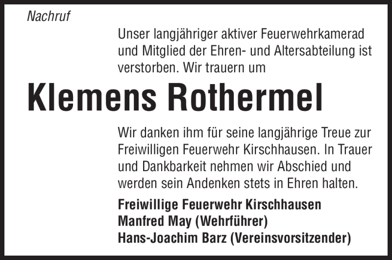 Hier finden Sie alle Traueranzeigen aus der Zeitung, die bisher für Klemens Rothermel erschienen sind. Weitere Traueranzeigen, die in der Zeitung erscheinen, werden hier ebenfalls aufgelistet