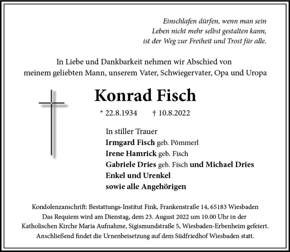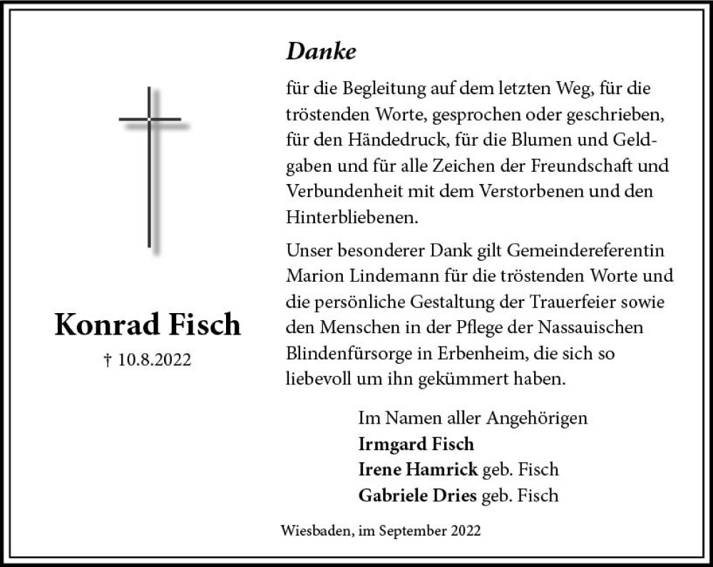 Hier finden Sie alle Traueranzeigen aus der Zeitung, die bisher für Konrad Fisch erschienen sind. Weitere Traueranzeigen, die in der Zeitung erscheinen, werden hier ebenfalls aufgelistet