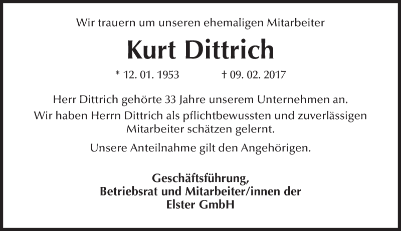 Hier finden Sie alle Traueranzeigen aus der Zeitung, die bisher für Kurt Dittrich erschienen sind. Weitere Traueranzeigen, die in der Zeitung erscheinen, werden hier ebenfalls aufgelistet