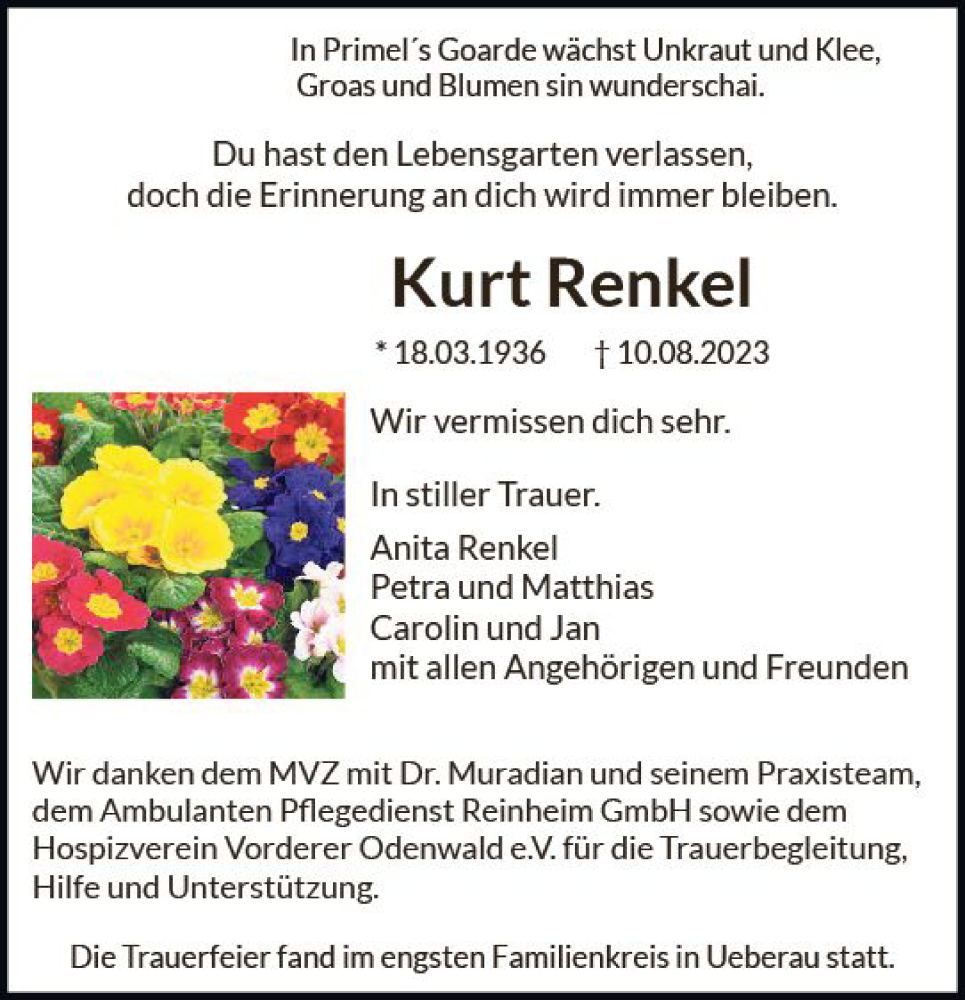 Hier finden Sie alle Traueranzeigen aus der Zeitung, die bisher für Kurt Renkel erschienen sind. Weitere Traueranzeigen, die in der Zeitung erscheinen, werden hier ebenfalls aufgelistet
