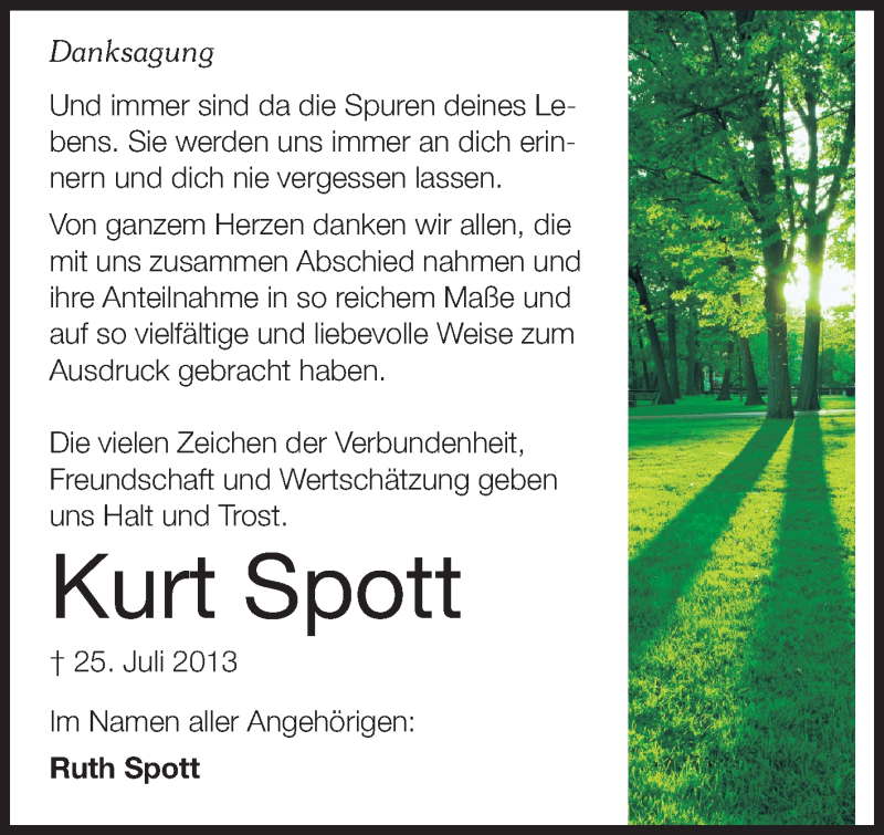 Hier finden Sie alle Traueranzeigen aus der Zeitung, die bisher für Kurt Spott erschienen sind. Weitere Traueranzeigen, die in der Zeitung erscheinen, werden hier ebenfalls aufgelistet