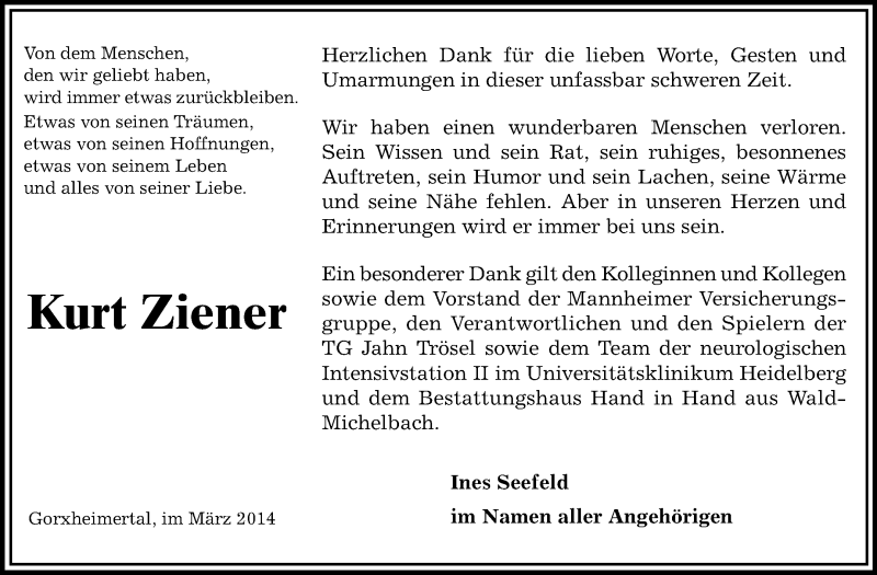 Hier finden Sie alle Traueranzeigen aus der Zeitung, die bisher für Kurt Ziener erschienen sind. Weitere Traueranzeigen, die in der Zeitung erscheinen, werden hier ebenfalls aufgelistet
