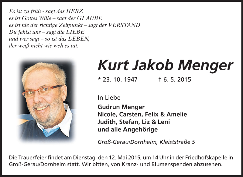 Hier finden Sie alle Traueranzeigen aus der Zeitung, die bisher für Kurt Jakob Menger erschienen sind. Weitere Traueranzeigen, die in der Zeitung erscheinen, werden hier ebenfalls aufgelistet