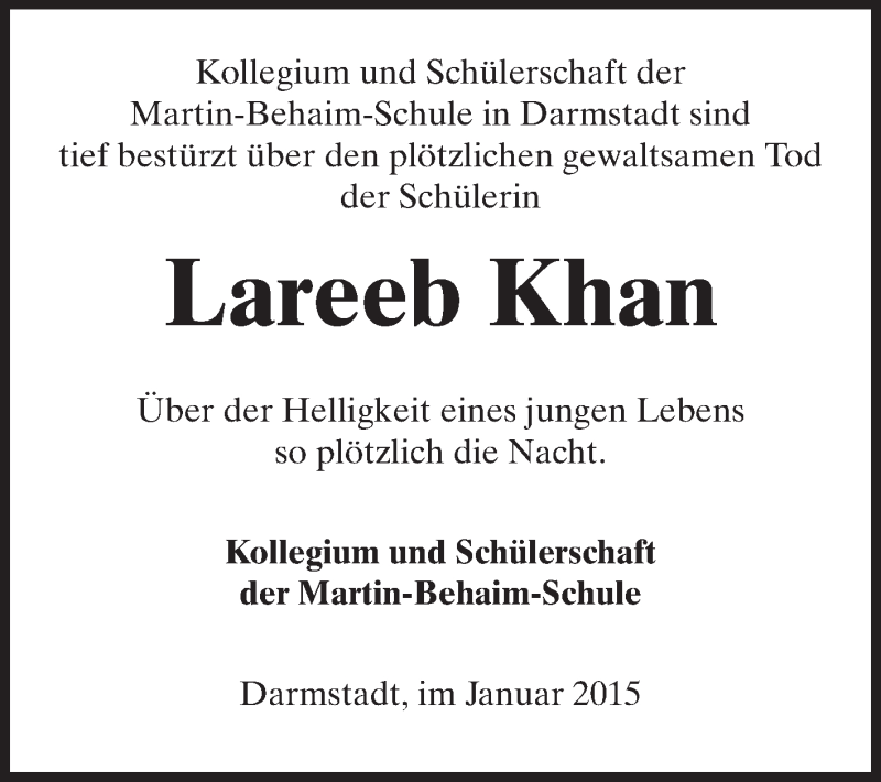 Hier finden Sie alle Traueranzeigen aus der Zeitung, die bisher für Lareeb Khan erschienen sind. Weitere Traueranzeigen, die in der Zeitung erscheinen, werden hier ebenfalls aufgelistet