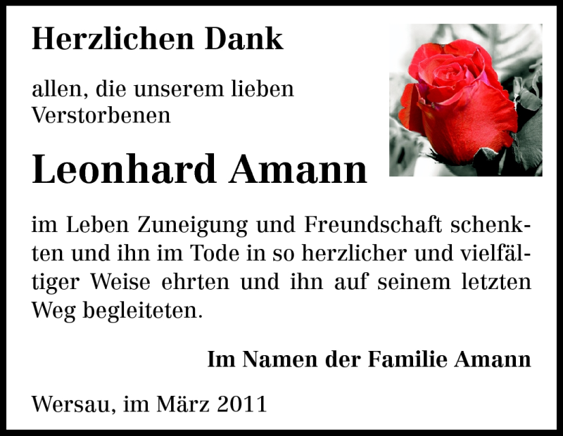 Hier finden Sie alle Traueranzeigen aus der Zeitung, die bisher für Leonhard Amann erschienen sind. Weitere Traueranzeigen, die in der Zeitung erscheinen, werden hier ebenfalls aufgelistet
