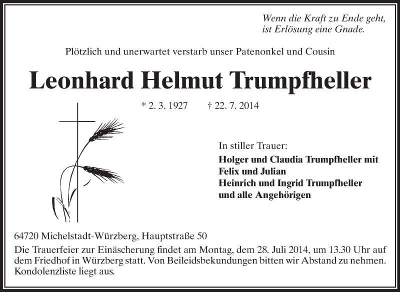 Hier finden Sie alle Traueranzeigen aus der Zeitung, die bisher für Leonhard Helmut Trumpfheller erschienen sind. Weitere Traueranzeigen, die in der Zeitung erscheinen, werden hier ebenfalls aufgelistet