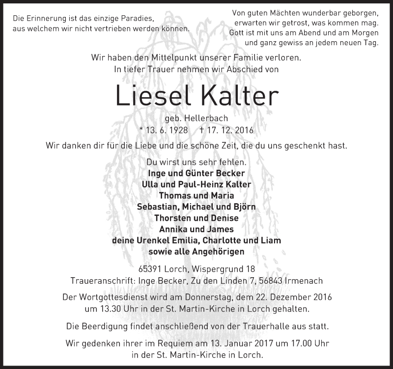 Hier finden Sie alle Traueranzeigen aus der Zeitung, die bisher für Liesel Kalter erschienen sind. Weitere Traueranzeigen, die in der Zeitung erscheinen, werden hier ebenfalls aufgelistet